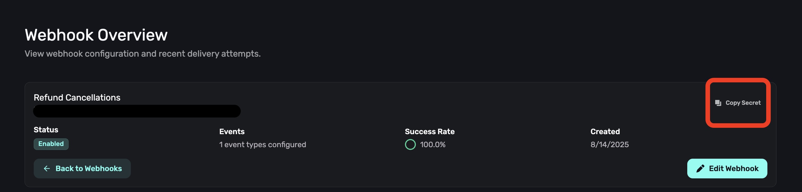 Click the Copy Secret button to copy your webhook's signing secret to your clipboard.